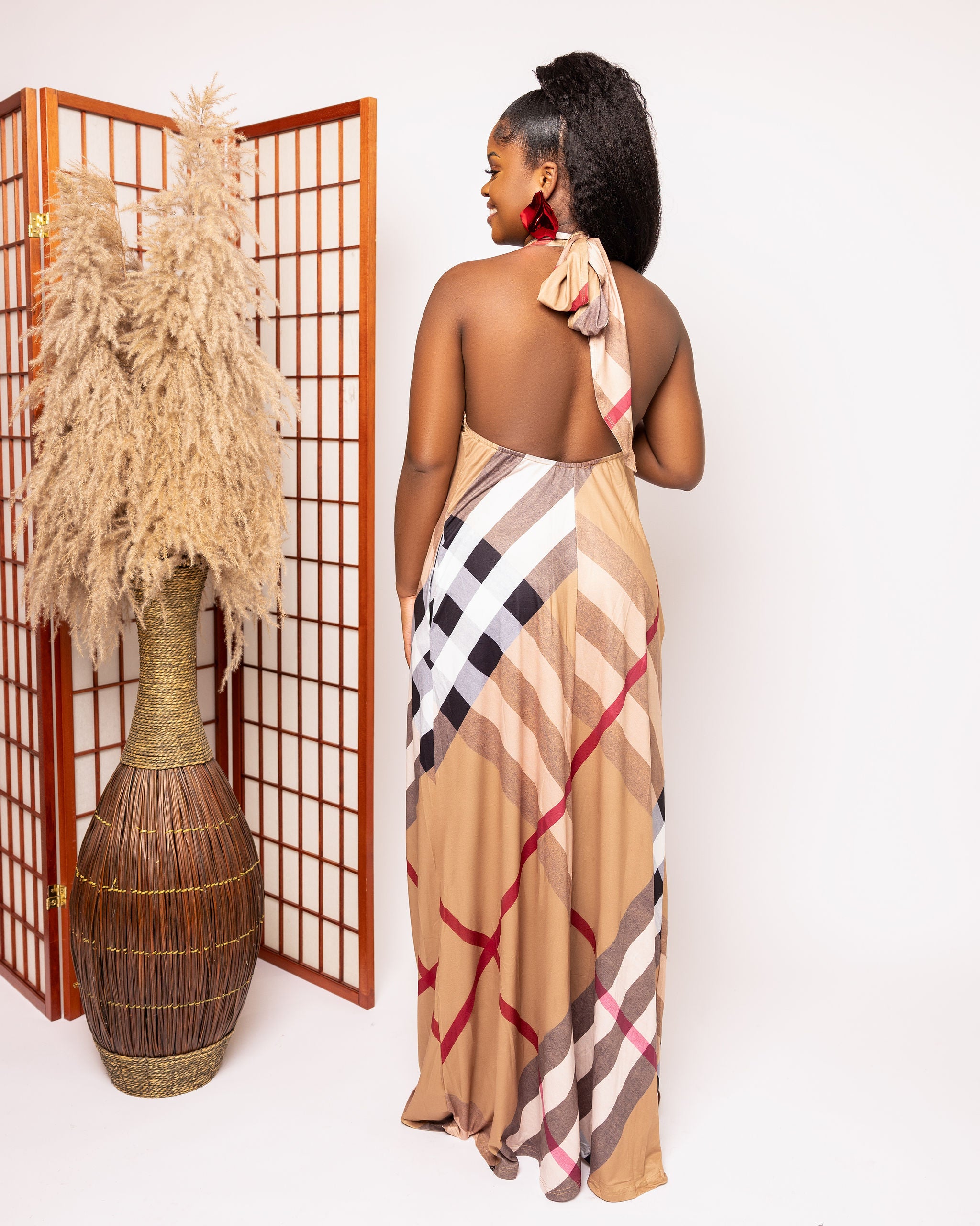This halter-style maxi dress boasts a sophisticated plaid pattern in neutral tones, offering a contemporary yet classic look. The lightweight fabric and halter neckline make it a perfect choice for summer outings or casual chic events."