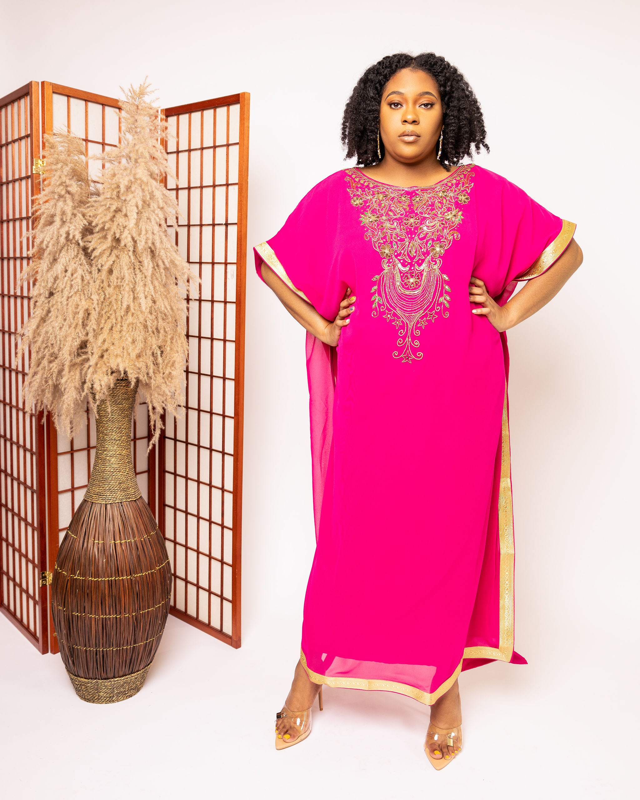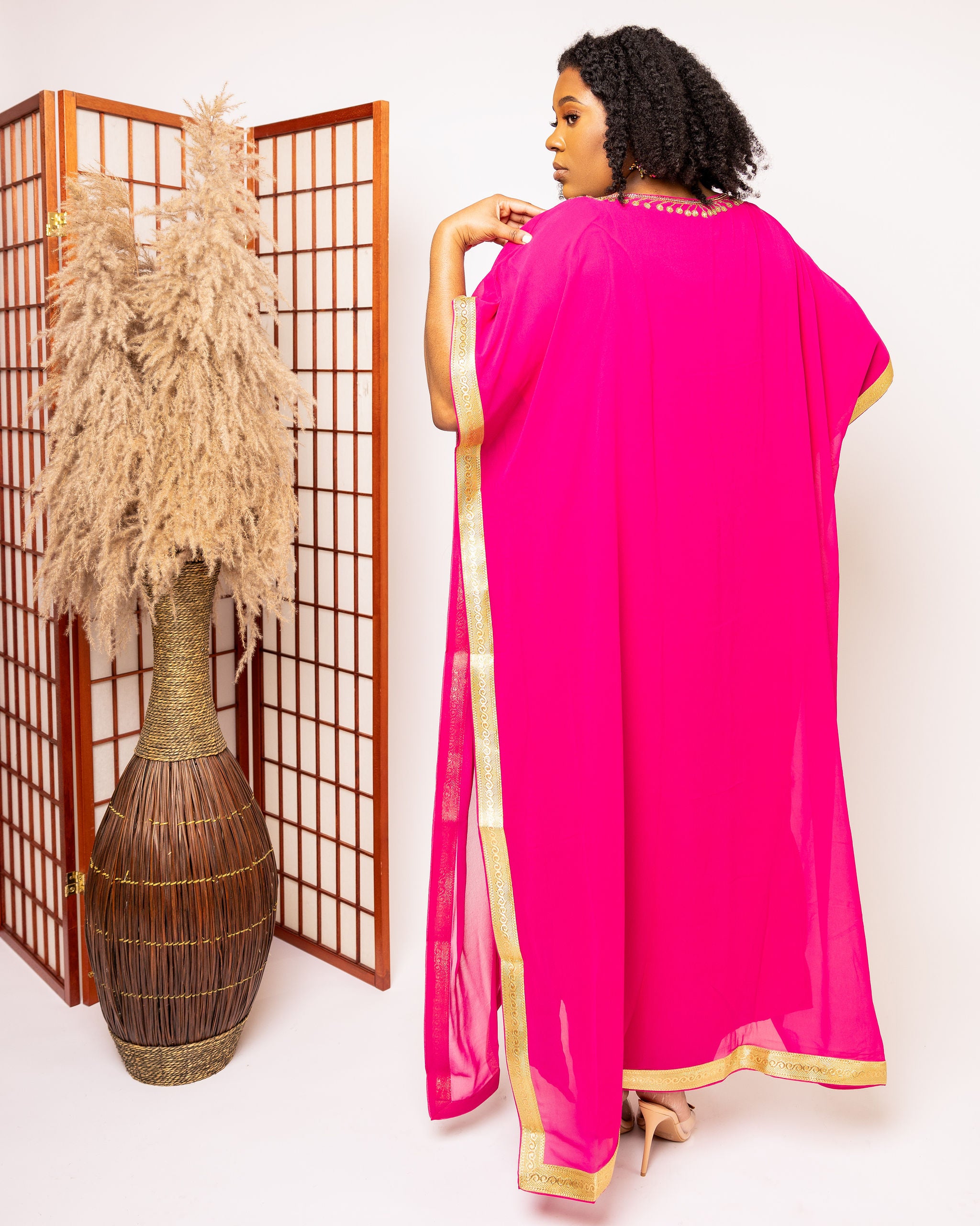 A vibrant fuchsia pink kaftan with intricate gold embroidery along the neckline and edges, adding a regal and elegant touch. The flowy silhouette ensures comfort and sophistication, making it ideal for special occasions or celebratory gatherings."