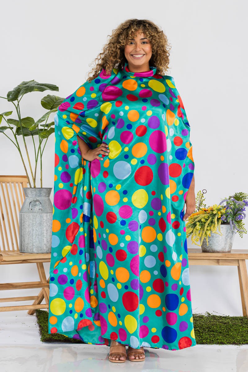 A vibrant cape dress featuring a bold multicolored polka dot pattern on a bright turquoise base. This statement piece adds a playful and artistic flair to any outfit. Perfect for creative events or fashion-forward moments.