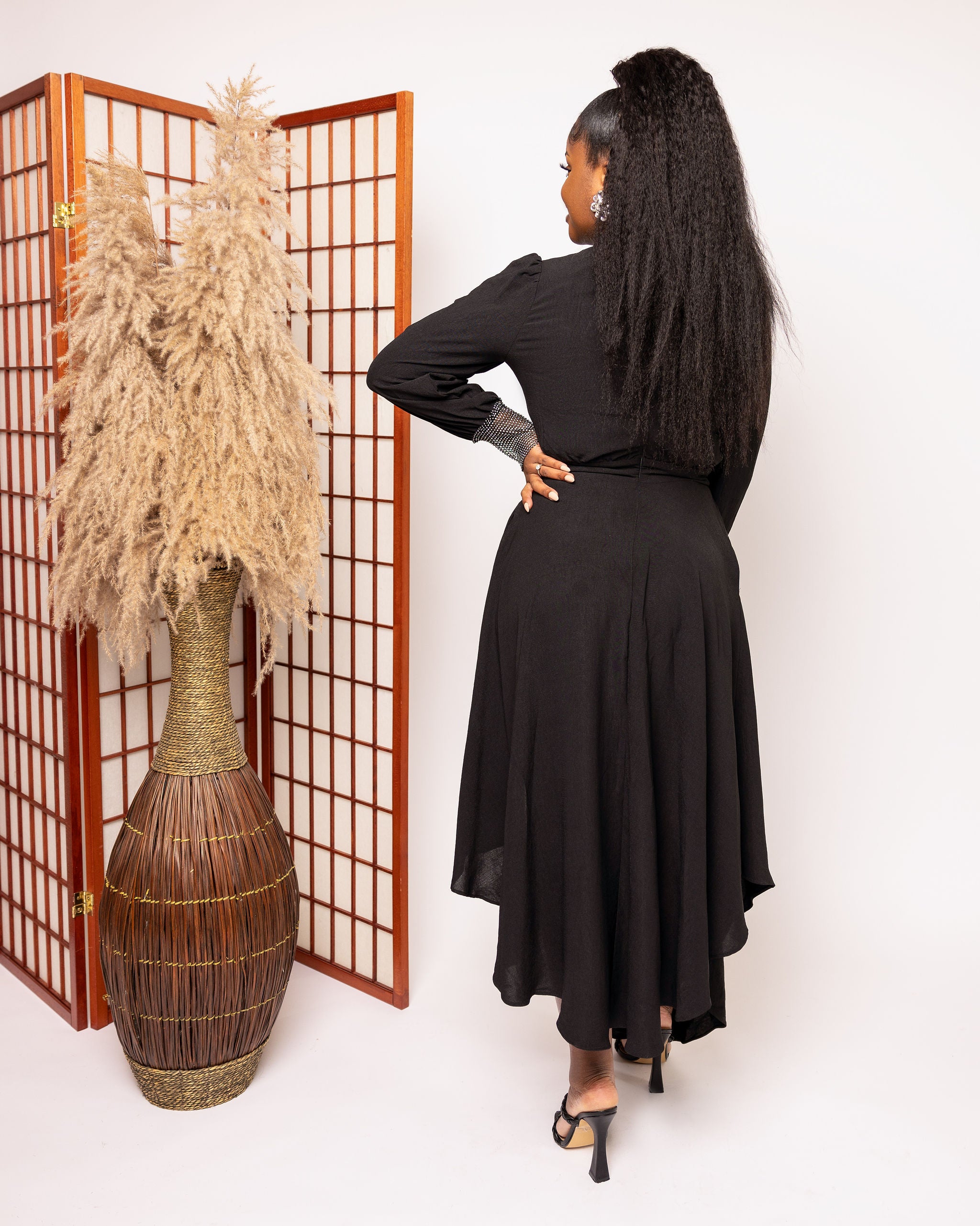 A timeless black asymmetric dress with glittering cuff embellishments and a high neckline. The dramatic silhouette, paired with its flowing design, exudes sophistication and class, perfect for evening galas or formal occasions."
